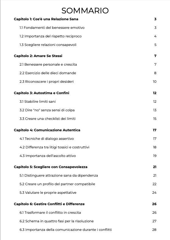In questo libro troverai tutto quello che cerchi per ottenere una relazione equilibrata e consapevole — strumenti pratici, riflessioni psicologiche e strategie concrete per costruire un legame autentico.